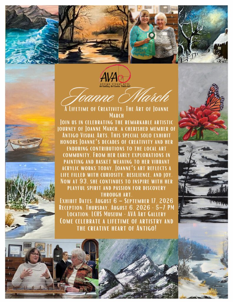 Join us in celebrating the remarkable artistic journey of Joanne March, a cherished member of Antigo Visual Arts. This special solo exhibit honors Joanne’s decades of creativity and her enduring contributions to the local art community. From her early explorations in painting and basket weaving to her vibrant acrylic works today, Joanne’s art reflects a life filled with curiosity, resilience, and joy. Now at 93, she continues to inspire with her playful spirit and passion for discovery through art.