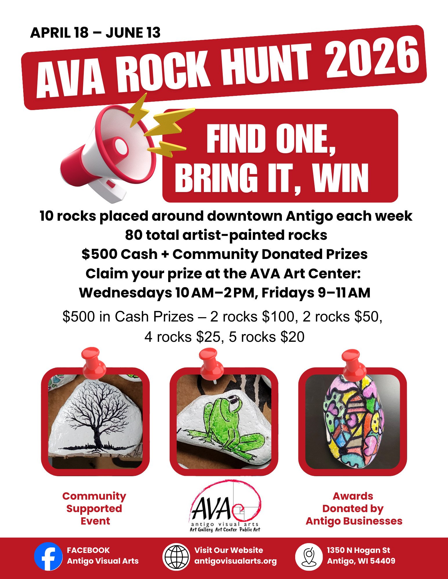 Join the fun this spring with AVA Rock Hunt 2026 in downtown Antigo! Every week, 10 artist-painted rocks will be placed around town for 8 weeks, giving you 80 chances to find a rock and win.